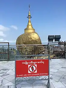Kyaiktiyo Pagoda or Golden Rock has become a popular pilgrimage and also tourist attraction. At the peak of the pilgrimage season, during November to March, an atmosphere of devotion is witnessed at Kyaikhtiyo pagoda. As the golden rock gleams in different shades from dawn to dusk (the sight at dawn and at sunset are unique), pilgrims' chants reverberate in the precincts of the shrine. Lighting of candles, meditation and offerings to the Buddha continues throughout the night. Men cross over a bridge across an abyss to affix golden leaves (square in shape) on the face of the Golden Rock, in deep veneration. However, women are not allowed to touch the rock so cannot cross the bridge. Pilgrims visit the pagoda, from all regions of Myanmar; a few foreign tourists also visit the pagoda. Even disabled persons who are staunch devotees of Buddha visit the pagoda, walking up the track on crutches. Old people, who can not climb, are carried on stretchers by porters to the Pagoda to offer prayers to Buddha.[3][5][14] The Full Moon day of Tabaung in March, is a special occasion for pilgrims who visit the shrine. On this day, the platform of the pagoda is lighted with ninety thousand candles as reverential offering to the Buddha. The devotees visiting the pagoda also offer fruits, food and incense to the Buddha.[7][15]
