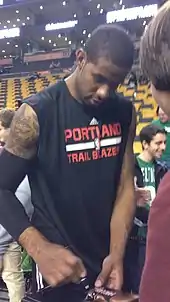 Despite trade rumors during the 2013 offseason, Aldridge voiced his desire to stay put in Portland, while also asking for improvements to the Blazers' roster.[18] Aldridge started out his eighth NBA season strong, recording five straight double-doubles from November 9 to 17. On November 23, 2013, in a game against the Warriors, Aldridge was involved in an altercation after Warriors center Andrew Bogut became entangled with Joel Freeland. On November 25, it was announced that he was fined $45,000 for escalating the incident.[19] The very same day, Aldridge was named Western Conference Player of the Week for the fourth time in his career. The award came in the midst of an 11-game win streak for the Blazers, during which Aldridge averaged 21.1 points, 11.3 rebounds, 2.5 assists, and 2.5 blocks per game. On December 12, 2013, Aldridge scored 31 points and grabbed a career-high 25 rebounds in a 111–104 victory over the Houston Rockets, becoming the first player in Portland Trail Blazers franchise history with at least 30 points and 25 rebounds in a game.[20] On January 23, 2014, Aldridge recorded a career-high 44 points along with 13 rebounds, 5 assists and 2 blocks in a 110–105 victory over the Denver Nuggets.[21]