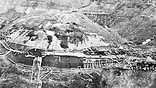 The Allies first noticed construction activity at Wizernes in mid-August 1943 when the Germans began building railway track and the offloading stores into the old quarry.[17] After Hitler authorised the decision to turn the depot into a missile launch site, construction was stepped up. Work on the dome began in November 1943[18] and tunnelling in the cliff face below began in December. At the start of January, Allied reconnaissance aircraft observed an elaborate system of camouflage on the hilltop, installed to conceal the dome.[17] The building works were greatly hindered by the constant air-raid warnings, which stopped work 229 times in May 1944 alone. In response to Hitler's desire to see the site completed the workforce was expanded substantially from 1,100 in April 1944 to nearly 1,400 by June.[19] About 60% of the workers were Germans; skilled workers, such as miners from Westphalia, were recruited to excavate the tunnels and build the dome.[20] The remainder were principally Frenchmen conscripted by the Service du travail obligatoire (STO), plus Soviet prisoners of war.[9] The project was overseen by several large German construction companies, with Philipp Holzman A.G. of Frankfurt am Main and the Grossdeutsche Schachtbau and Tiefbohr GmbH serving as the chief contractors.[21]