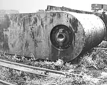 As an additional bomb-proofing method, the dome was surrounded by a bomb-proof "skirt" or Zerschellerplatte of steel-reinforced concrete, 14 metres (46 ft) wide and 2 metres (6.6 ft) thick. This was supported by a series of buttresses, which were not tied into the dome itself, above the entrances to the Gustav and Gretchen tunnels. Another concrete structure was tied into the skirt to the north-west of the dome, which was perhaps intended for use as an observation and control tower. A separate underground building was constructed on the western side of the quarry to serve as a hospital and as offices for the engineers.[23] A Decauville narrow-gauge railway was installed on the quarry floor to transport supplies from the main line to the construction site.[24]