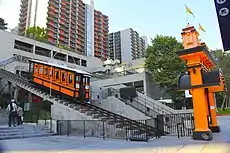 Chazelle scouted for "old L.A." locations that were in ruins, or were perhaps razed. One such example was the use of the Angels Flight trolley, built in 1901. The funicular had been closed in 2013 after a derailment. Attempts were made to repair and re-open the railway, but to no avail. However, the production team was able to secure permission to use it for a day. Chazelle and his crew then arranged to have it run for shooting (it was re-opened to the public in 2017).[22] Mia works at a coffee shop on the Warner Bros. studio lot; Chazelle considered studio lots to be "monuments" of Hollywood. Production designer Wasco created numerous fake old film posters. Chazelle occasionally created names for them, deciding to use the title of his first feature, Guy and Madeline on a Park Bench (2009) for one poster, which reimagines it as a 1930s musical.[22]