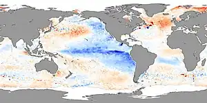 Tropical instability waves visible on sea surface temperature maps, showing a tongue of colder water, are often present during neutral or La Niña conditions.[8]