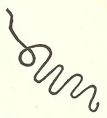 At the start of the novel, Balzac includes an image from Laurence Sterne's 1759 novel Tristram Shandy: a curvy line drawn in the air by a character seeking to express the freedom enjoyed "whilst a man is free".[29] Balzac never explained his purpose behind the use of the symbol, and its significance to La Peau de chagrin is the subject of debate. In his comprehensive review of La Comédie humaine, Herbert J. Hunt connects the "serpentine squiggle" to the "sinuous design" of Balzac's novel.[30] Critic Martin Kanes, however, suggests that the image symbolizes the impossibility of language to express an idea fully. This dilemma, he proposes, is directly related to the conflict between will and knowledge indicated by the shopkeeper at the start of the novel.[31]