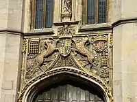 In 1502 she established the Lady Margaret's Professorship of Divinity at the University of Cambridge.[70][71] In 1505 she refounded and enlarged God's House, Cambridge as Christ's College, Cambridge with a royal charter from the king. She has been honoured ever since as the Foundress of the College. A copy of her signature can be found carved on one of the buildings (4 staircase, 1994) within the College. In 1511, St. John's College, Cambridge was founded by her estate, either at her direct behest or at the suggestion of her chaplain, John Fisher. Land that she owned around Great Bradley in Suffolk was bequeathed to St. John's upon its foundation. Her portraits hang in the Great Halls and other college rooms of both Christ's and St. John's, accompanied by portraits of John Fisher. Unusually, both colleges have the same coats of arms, using her crest and motto. Furthermore, various societies, including the Lady Margaret Society as well as the Beaufort Club at Christ's, and the Lady Margaret Boat Club at John's, were named after her.[72]