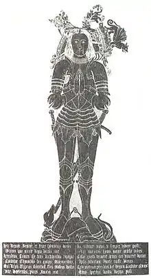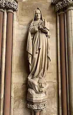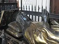 Her tomb was created by Pietro Torrigiano, who probably arrived in England in 1509 and received the commission in the following year.[66] The gilded bronze sculpture on the tomb depicts Margaret with her head resting on pillows and her hands raised in prayer, wearing garments characteristic of widowhood; the face was probably sculpted from a death mask. The black marble tomb is embellished with heraldic bronze insignia, including a yale, her heraldic badge, at her feet.[67]