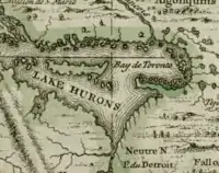 On the eve of European contact, the extent of development among Eastern Woodlands Native American societies is indicated by the archaeological evidence of a town on or near Lake Huron that contained more than one hundred large structures housing a total population of between 4,000 and 6,000.[19] The French, the first European visitors to the region, often referred to Lake Huron as La Mer Douce, "the fresh-water sea". In 1656, a map by French cartographer Nicolas Sanson refers to the lake by the name Karegnondi, a Wyandot word that has been translated variously, as "Freshwater Sea", "Lake of the Hurons", or simply "lake".[20][21] Generally, the lake was labeled "Lac des Hurons" (Lake of the Huron) on most early European maps.[21]