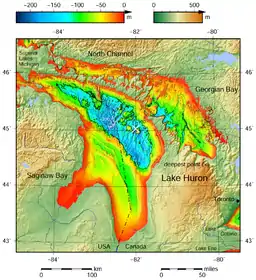 - National Geophysical Data Center (1999). "Bathymetry of Lake Huron". National Oceanographic and Atmospheric Administration. doi:10.7289/V5G15XS5. Retrieved March 23, 2015.