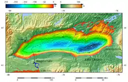 Lake Ontario is the easternmost of the Great Lakes and the smallest in surface area (7,340 sq mi, 19,000 km2),[5] although it exceeds Lake Erie in volume (393 cu mi, 1,640 km3). It is the 13th largest lake in the world. When its islands are included, the lake's shoreline is 712 miles (1,146 km) long. As the last lake in the Great Lakes' hydrologic chain, Lake Ontario has the lowest mean surface elevation of the lakes at 243 feet (74 m)[6] above sea level; 326 feet (99 m) lower than its neighbor upstream. Its maximum length is 193 statute miles (311 kilometres; 168 nautical miles), and its maximum width is 53 statute miles (85 km; 46 nmi).[6] The lake's average depth is 47 fathoms 1 foot (283 ft; 86 m), with a maximum depth of 133 fathoms 4 feet (802 ft; 244 m).[6][7] The lake's primary source is the Niagara River, draining Lake Erie, with the Saint Lawrence River serving as the outlet. The drainage basin covers 24,720 square miles (64,030 km2).[5][10] As with all the Great Lakes, water levels change both within the year (owing to seasonal changes in water input) and among years (owing to longer-term trends in precipitation). These water level fluctuations are an integral part of lake ecology and produce and maintain extensive wetlands.[11][12] The lake also has an important freshwater fishery, although it has been negatively affected by factors including overfishing, water pollution and invasive species.[13]