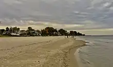 Baymouth bars built by prevailing winds and currents have created a significant number of lagoons and sheltered harbors, mostly near (but not limited to) Prince Edward County, Ontario, and the easternmost shores. Perhaps the best-known example is Toronto Bay, chosen as the site of the Upper Canada capital for its strategic harbor. Other prominent examples include Hamilton Harbour, Irondequoit Bay, Presqu'ile Bay, and Sodus Bay. The bars themselves are the sites of long beaches, such as Sandbanks Provincial Park and Sandy Island Beach State Park. These sand bars are often associated with large wetlands, which support large numbers of plant and animal species, as well as providing important rest areas for migratory birds.[14][15] Presqu'ile, on the north shore of Lake Ontario, is particularly significant in this regard. One unique feature of the lake is the Z-shaped Bay of Quinte which separates Prince Edward County from the Ontario mainland, save for a 2-mile (3.2 km) isthmus near Trenton; this feature also supports many wetlands and aquatic plants, as well as associated fisheries.