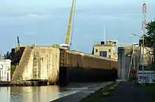 The Canadian cities of Hamilton, Kingston, Mississauga, and Toronto are located on the lake's northern shorelines, while the American city of Rochester is located on the south shore. In the Huron language, the name Ontarí'io means "great lake". Its primary inlet is the Niagara River from Lake Erie. The last in the Great Lakes chain, Lake Ontario serves as the outlet to the Atlantic Ocean via the Saint Lawrence River, comprising the western end of the Saint Lawrence Seaway. The Long Sault control dam, primarily along with the Moses-Saunders Power Dam regulates the water level of the lake.[9]