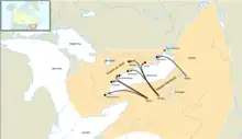 The name Ontario is derived from the Huron word Ontarí'io, which means "great lake". In Colonial times, the lake was also called Cataraqui, a French spelling of the Mohawk Katarokwi.[30][31] The lake was a border between the Huron people and the Iroquois Confederacy in the pre-Columbian era. In the 15th century, the Iroquois drove out the Huron from southern Ontario and settled the northern shores of Lake Ontario. When the Iroquois withdrew and the Anishnabeg / Ojibwa / Mississaugas moved in from the north to southern Ontario, they retained the Iroquois name.[32] Artifacts believed to be of Norse origin have been found in the area of Sodus Bay, indicating the possibility of trading by the indigenous peoples with Norse explorers on the east coast of North America.[33]