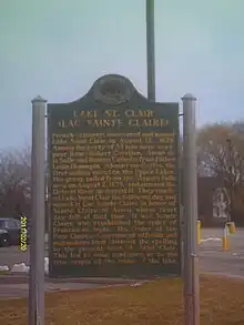 Lake St. Clair (French: Lac Sainte-Claire) is a freshwater lake that lies between the Canadian province of Ontario and the U.S. state of Michigan. It was named in 1679 by French Catholic explorers after Saint Clare of Assisi, on whose feast day they first saw the lake.