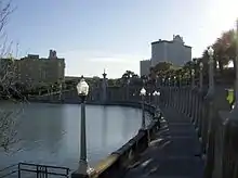 Lake Mirror Park in downtown Lakeland, with surrounding City Hall and Lakeland Terrace Hotel