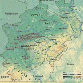 The state's area covers a maximum distance of 291 km from north to south, and 266 km from east to west. The total length of the state's borders is 1,645 km. The following countries and states have a border with North Rhine-Westphalia:[9]