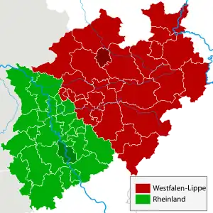 | Landschaftsverband Rhineland | Landschaftsverband Westfalen-Lippe | The regional authorities Rhineland (green) and Westphalia-Lippe (red) | ||||