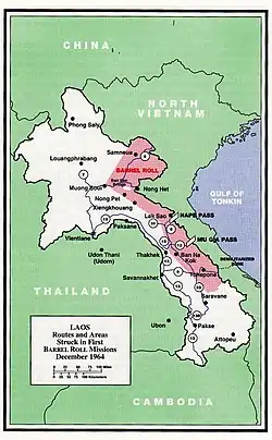 ![]() Areas of Laos controlled by the Pathet Lao and bombed by the United States Air Force in support of the Kingdom of Laos. | |||||||
