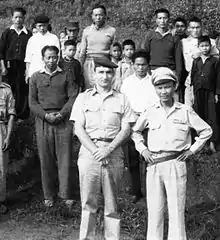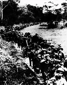 In August 1950, Souphanouvong had joined the Viet Minh in their headquarters north of Hanoi, Vietnam, and become the head of the Pathet Lao, along with its political arm dubbed Neo Lao Hak Sat (Lao Patriotic Front).[30] This was an attempt to give a false front of authority to the Lao communist movement by claiming to represent a united non-partisan effort. Two of its most important founders were members of the Indochinese Communist Party, which advocated overthrow of the monarchy as well as expulsion of the French. This got Laos involved in the First Indochina War, but it started off mainly against the French.[31]