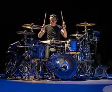 Mullen was heavily influenced by glam rock acts of the 1970s when first learning to play drums.[20] In the early days of U2, he had what Bono called a "florid" drumming style, before he eventually adopted a philosophy of simplicity and pared down his rhythms.[3][23] His drumming leaves open space, owing to what Modern Drummer described as his understanding of "when to hit and when not to hit".[3] As he matured as a timekeeper, he developed a preternatural sense of rhythm; Eno recounted one occasion when Mullen noticed that his click track had been set incorrectly by just six milliseconds.[24] Under the tutelage of Lanois, Mullen learned more about his musical role as the drummer in filling out the band's sound, while producer Flood helped Mullen learn to play along with electronic elements such as drum machines and samples.[20] His kit has a tambourine mounted on a cymbal stand,[25] which he uses as an accent on certain beats for songs such as "With or Without You".[3][26]