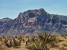 Las Vegas is in Clark County, in a basin on the floor of the Mojave Desert,[34] and is surrounded by mountain ranges. Much of the landscape is rocky and arid, with desert vegetation and wildlife. It can be subjected to torrential flash floods, although much has been done to mitigate the effects of flash floods through improved drainage systems.[35]