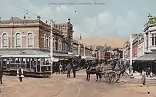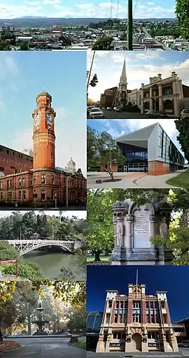 ![]() Montage of Launceston. Clockwise from top – Launceston panorama, Paterson Street, Australian Technical College (ATC), Boer War Memorial, The Examiner building, The Barbezat Fountain, King's Bridge, Launceston Post Office, | |||||||||||||||