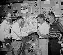 The first important work on element 103 was done at Berkeley by the nuclear-physics team of Albert Ghiorso, Torbjørn Sikkeland, Almon Larsh, Robert M. Latimer, and their co-workers on February 14, 1961.[40] The first atoms of lawrencium were reportedly made by bombarding a three-milligram target consisting of three isotopes of californium with boron-10 and boron-11 nuclei from the Heavy Ion Linear Accelerator (HILAC).[41] The Berkeley team reported that the isotope 257103 was detected in this manner, and that it decayed by emitting an 8.6 MeV alpha particle with a half-life of 8±2 s.[39] This identification was later corrected to 258103,[41] as later work proved that 257Lr did not have the properties detected, but 258Lr did.[39] This was considered at the time to be convincing proof of synthesis of element 103: while the mass assignment was less certain and proved to be mistaken, it did not affect the arguments in favor of element 103 having been synthesized. Scientists at Joint Institute for Nuclear Research in Dubna (then in the Soviet Union) raised several criticisms: all but one were answered adequately. The exception was that 252Cf was the most common isotope in the target, and in the reactions with 10B, 258Lr could only have been produced by emitting four neutrons, and emitting three neutrons was expected to be much less likely than emitting four or five. This would lead to a narrow yield curve, not the broad one reported by the Berkeley team. A possible explanation was that there was a low number of events attributed to element 103.[39] This was an important intermediate step to the unquestioned discovery of element 103, although the evidence was not completely convincing.[39] The Berkeley team proposed the name "lawrencium" with symbol "Lw", after Ernest Lawrence, inventor of the cyclotron. The IUPAC Commission on Nomenclature of Inorganic Chemistry accepted the name, but changed the symbol to "Lr".[42] This acceptance of the discovery was later characterized as being hasty by the Dubna team.[39]