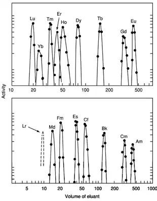 1969 studies on the element showed that lawrencium reacts with chlorine to form a product that was most likely the trichloride, LrCl3. Its volatility was found to be similar to the chlorides of curium, fermium, and nobelium and much less than that of rutherfordium chloride. In 1970, chemical studies were performed on 1500 atoms of 256Lr, comparing it with divalent (No, Ba, Ra), trivalent (Fm, Cf, Cm, Am, Ac), and tetravalent (Th, Pu) elements. It was found that lawrencium coextracted with the trivalent ions, but the short half-life of 256Lr precluded a confirmation that it eluted ahead of Md3+ in the elution sequence.[57] Lawrencium occurs as the trivalent Lr3+ ion in aqueous solution and hence its compounds should be similar to those of the other trivalent actinides: for example, lawrencium(III) fluoride (LrF3) and hydroxide (Lr(OH)3) should both be insoluble in water.[57] Due to the actinide contraction, the ionic radius of Lr3+ should be smaller than that of Md3+, and it should elute ahead of Md3+ when ammonium α-hydroxyisobutyrate (ammonium α-HIB) is used as an eluant.[57] Later 1987 experiments on the longer-lived isotope 260Lr confirmed lawrencium's trivalency and that it eluted in roughly the same place as erbium, and found that lawrencium's ionic radius was 88.6±0.3 pm, larger than would be expected from simple extrapolation from periodic trends.[57] Later 1988 experiments with more lawrencium atoms refined this to 88.1±0.1 pm and calculated an enthalpy of hydration value of −3685±13 kJ/mol.[57] It was also found that the actinide contraction at the end of the actinides was larger than the analogous lanthanide contraction, with the exception of the last actinide, lawrencium: the cause was speculated to be relativistic effects.[57]