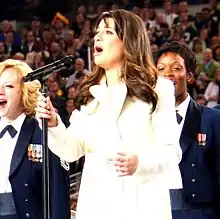 In October 2010, Michele and co-star Matthew Morrison performed as Janet Weiss and Brad Majors, respectively, in the 35th anniversary benefit concert of The Rocky Horror Picture Show. The event benefited The Painted Turtle and also starred Jack Nicholson and Danny DeVito.[52] In February 2011, Michele performed at The Grammys' MusiCares Person of the Year event in Los Angeles, honoring Barbra Streisand. She sang "My Man" from the Streisand film Funny Girl.[53] Before the Super Bowl XLV on February 6, 2011, Michele performed "America the Beautiful" with the United States Air Force Tops In Blue.[54] She then starred in Garry Marshall's romantic comedy film New Year's Eve portraying Elise, a back-up singer and the love interest of Ashton Kutcher's character.[55] The film was released worldwide on December 9, 2011.