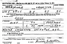 The younger of two children, Lead Belly was born Huddie William Ledbetter to Sallie Brown and Wesley Ledbetter on a plantation near Mooringsport, Louisiana.[6] On his World War II draft registration card in 1942, he gave his birthplace as Freeport, Louisiana ("Shreveport"). There is uncertainty over his precise date and year of birth. The Lead Belly Foundation gives his birth date as January 20, 1889,[7] his grave marker gives the year 1889, and his 1942 draft registration card states January 23, 1889.