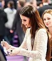 Meyer-Landrut was president of the German jury, also including Carolin Niemczyk, Alina Süggeler, Tim Bendzko and Florian Silbereisen, and the spokesperson for Germany, revealing the countries voting results at the Eurovision Song Contest 2013 final on 18 May.[65] In July 2013, it was announced that she would be the German voice of Jane in the motion capture animated film Tarzan 3D, which was released in German cinemas in February 2014.[66][67] In the same month she dubbed the voice of three characters in the two audiobooks Giraffenaffen – Wir sind da! and Giraffenaffen – Die Schatzssuche, which were both published in October 2013.[68] Meyer-Landrut re-united with her Eurovision mentor Stefan Raab in October 2013 when she was featured on "Revolution", a single released by Raab's band Dicks on Fire.[69] In June 2013, this song was used for a video promoting the Doosh shower head Doosh, invented by Stefan Raab. In it Lena poses as Lara Croft in the shower. In 2013 she became a L'Oréal hair coloring and skin care products brand ambassador.[70]