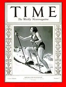 On one of her adventures, Riefenstahl met Luis Trenker, an actor who had appeared in Mountain of Destiny.[18] At a meeting arranged by her friend Gunther Rahn, she met Arnold Fanck, the director of Mountain of Destiny and a pioneer of the mountain film genre.[18] Fanck was working on a film in Berlin. After Riefenstahl told him how much she admired his work, she also convinced him of her acting skill.[18] She persuaded him to feature her in one of his films.[18] Riefenstahl later received a package from Fanck containing the script of the 1926 film The Holy Mountain.[18] She made a series of films for Fanck, where she learned from him acting and film editing techniques.[18] One of Fanck's films that brought Riefenstahl into the limelight was The White Hell of Pitz Palu of 1929, co-directed by G. W. Pabst.[18] She had to undergo many physical challenges that would probably be deemed unethical in today’s standards. Some of the torments included: being engulfed in small avalanches, jumping into mountain lakes and icy streams, climbing rocky pinnacles barefoot, letting herself be pulled up a rock face as she was pelted by snow and ice, balancing on a ladder above a deep glacial crevasse, and enduring obscene jokes from her exclusively male colleagues.[19] Her fame spread to countries outside Germany.[18][12]