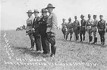 In 1914, Wood completed his term as chief of staff and was succeeded by William Wallace Wotherspoon.[57] As commander of the army's Eastern Department for the second time, Wood was a strong advocate of the Preparedness Movement, led by Republicans, which alienated him from President Woodrow Wilson, a Democrat who pursued an isolationist and pacifist foreign policy.[58] Wood made speeches and wrote articles to advocate preparedness and in 1915 a collection of these works were published as a pro-preparedness book, The Military Obligation of Citizenship.[59] In 1916 he was elected as an honorary member of the Rhode Island Society of the Cincinnati.[60] He served as a member of Harvard University's board of overseers from 1917 to 1923.[14]