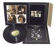 In most countries except the United States,[44] the Let It Be LP was originally presented in a box with a full colour book. The book contained photos by Ethan Russell from the January 1969 filming, dialogue from the film, with all expletives removed at EMI's insistence, and essays by Rolling Stone writers Jonathan Cott and David Dalton.[44][58] Despite the new album title, the book was still titled Get Back.[59] Its inclusion was another step in the Beatles' efforts to provide increasingly elaborate packaging for their records since Sgt. Pepper's Lonely Hearts Club Band.[44] The book's lavishness increased production costs by 33 per cent, however,[60] driving the retail price higher than for any previous Beatles album.[61]