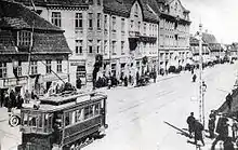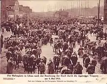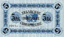 Following the outbreak of World War I, the German cruiser SMS Magdeburg shelled Libau (then part of Russia), and other vessels laid mines off the approaches to the port.[19] Libau was soon occupied by the German Army, on 7 May 1915, and in memory of this event, a monument was constructed on Kūrmājas Prospect in 1916 (removed in 1919 by the new Latvian State). Libau's local government issued its own money for a while in this period – Libaua rubles. An advanced German Zeppelin base was constructed at Vaiņode, near Libau, with five hangars, in August 1915.[20] On 23 October 1915, the German cruiser SMS Prinz Adalbert was sunk by the British submarine HMS E8, 37 km (20 nmi; 23 mi) west of Libau.