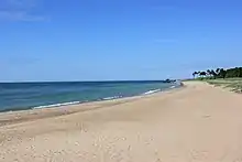 Liepāja is situated on the coast of the Baltic Sea in the south-western part of Latvia. The westernmost geographical point of Latvia is located approximately 15 km (9 mi) to the south thus making Liepāja Latvia's furthest west city. The city occupies a 1.5-6.5 km wide coastal dune embankment and a foothill plain in the Bartau Plain of the Seaside Lowland. Liepāja is surrounded by the Dienvidkurzeme Region, and is bordered to the north by Medze Parish, to the east by Grobiņa Parish, and to the south by Nīca Parish, with its western border following the Baltic Sea coast. The Trade Channel (Tirdzniecības kanāls) connects the lake to the sea dividing the city into southern and northern parts, which are often referred to as Vecliepāja (Old Town) and Jaunliepāja (New Town) respectively. Along the coast, the city extends northwards until it reaches the Karosta Channel (Karostas kanāls). North of the Karosta Channel is an area called Karosta which is now fully integrated into Liepāja and is the northernmost district of the city. Liepāja's coastline consists of an unbroken sandy beach and dunes. Natural areas cover about one third of the territory of the city. These areas are mostly located on the outskirts of the city and are not connected to the small green areas in the central part of the city.[29][30]