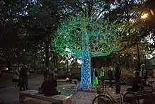 In the 19th and early 20th century, it was a favourite place for sea-bathers and travellers, with the town boasting a fine park, many pretty gardens and a theatre.[3] Liepāja is however known throughout Latvia as "City where the wind is born", likely because of the constant sea breeze. A song of the same name (Latvian: "Pilsētā, kurā piedzimst vējš") was composed by Imants Kalniņš and has become the anthem of the city. Its reputation as the windiest city in Latvia was strengthened with the construction of the largest wind farm in the nation (33 Enercon wind turbines) nearby.