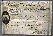 Life insurance certificate issued by the Yorkshire Fire & Life Insurance Company to Samuel Holt, Liverpool, England, 1851. On display at the British Museum in London