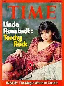 Her 1977 appearance on the cover of Time magazine under the banner "Torchy Rock" was also upsetting to Ronstadt, considering what the image appeared to project about the most famous woman in rock.[15][105] At a time in the industry when men still told women what to sing and what to wear,[106] Ronstadt hated the image of her that was projected to the world on that cover,[15] and she noted recently how the photographer kept forcing her to wear a dress, which was an image she did not want to project.[15] In 2004, she was interviewed for CBS This Morning[107] and stated that this image was not her because she did not sit like that. Asher noted, "Anyone who's met Linda for 10 seconds will know that I couldn't possibly have been her Svengali. She's an extremely determined woman, in every area. To me, she was everything that feminism's about."[106] Qualities which, Asher has stated, were considered a "negative (in a woman at that time), whereas in a man they were perceived as being masterful and bold".[81] Since her solo career had begun, Ronstadt had fought hard to be recognized as a solo female singer in the world of rock, and her portrayal on the Time cover did not appear to help the situation.[78]