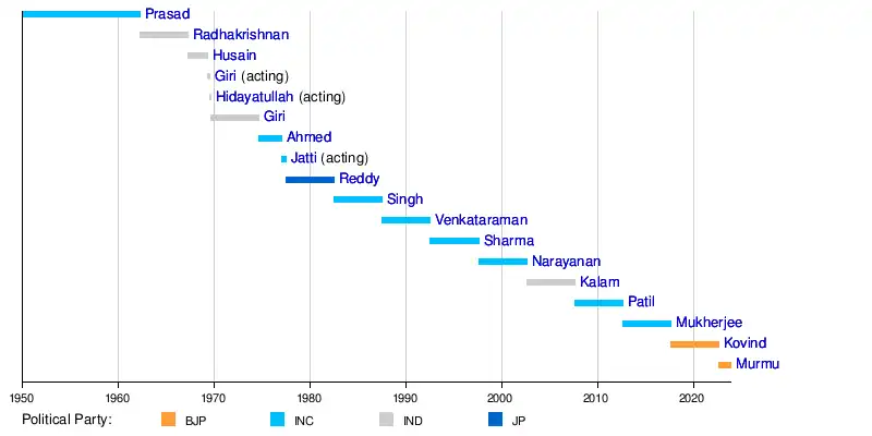 This list is numbered based on presidents elected after winning an Indian presidential election. The terms of Varahagiri Venkata Giri, M. Hidayatullah and B. D. Jatti, who served as acting president are therefore not numbered or counted as actual terms in office. The president of India does not represent any political party. The colors used in the table indicate the following: