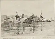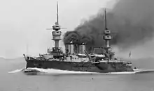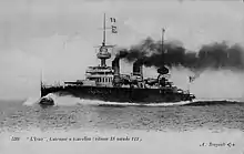 The ship's early career followed a similar trajectory to Charles Martel's; she spent much of it in the Mediterranean Squadron, and she too served with the International Squadron in 1897.[13] She thereafter began alternating stints in the Northern and Mediterranean Squadrons; she was with the Northern Squadron in 1901,[20] followed by a brief return to the Mediterranean as part of the Reserve Squadron in 1903.[21] The year 1904 saw her back with the Northern Squadron,[22] where she remained until 1907, when she was assigned to the 2nd Battle Squadron in the Mediterranean.[23] In early 1911, the unit was moved to Brest, France, before returning to Toulon later that year, where it was renumbered as the 3rd Squadron. Carnot was reduced to reserve in 1913 and was ultimately broken up in 1922.[24][25]