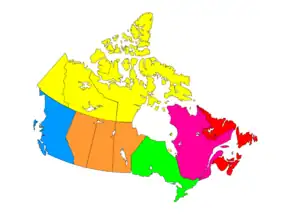 Statistics Canada uses the six-region model for the Geographical Regions of Canada.[1] Immigration, Refugees and Citizenship Canada uses the five-region model, while seven regions are commonly used for polling. The various models are derived from the three-region scheme by progressively subdividing the western and eastern regions (the northern region is the same for all models) into smaller and smaller units consisting of provinces or groups of provinces. If the models are not treated as mutually exclusive, eight distinct national regions can be identified when the three western regions of the seven region scheme are combined with the two Atlantic regions of the Senate method and the Ontario, Quebec, and Northern regions common to both schemes.