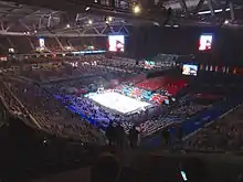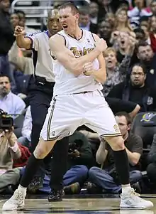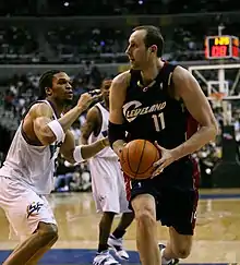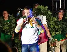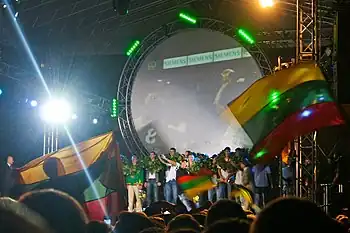 For the fourth post-independence Olympics, basketball captain Saulius Štombergas was given the honor to bear the Lithuanian flag during the opening ceremony.[103] The Olympic basketball for Lithuania started slowly, laboring to a victory against the African champions Angola 78–63, with their opponents shooting an excellent 52% from the three-point line. Lithuanian national team also had difficulties with Puerto Rico, depending on a high average of three-pointers to beat the NBA-heavy squad by 98–90. Then Lithuanians, in front of 12,000 spectators, achieved revenge against their Greek hosts, defeating them 98–76. The next match would be against the United States, which again featured major NBA stars such as Allen Iverson, Tim Duncan, and LeBron James, but had already been proven as faltering following a defeat to Puerto Rico. Lithuania managed to beat the United States 94–90, only the fourth defeat by the Americans in the Olympic stage.[104] Jasikevičius, who had lost a possible buzzer beater against the Dream Team four years before, managed to score 28 points, including a decisive 10-point barrage in 69 seconds that gave Lithuania the lead in the final minutes.[105] While the fifth game, versus Australia, was not significant for the group standings as the Lithuanians had already secured the first spot in the group, the Lithuanians still won 100–85, maintaining their good run.[106]