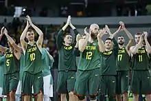 During the awarding ceremony, Lithuanians decided to dress up the colorful Skeleton Jerseys in order to show their newly reborn country national colors and to show their gratitude to Greg Speirs and the Grateful Dead for their financial support.[54] Rimas Kurtinaitis characterized the emotional awarding ceremony by saying: "Well, we cried. It was really from joy. Words cannot even express feelings like that. You need to be there".[55] Valdemaras Chomičius: "It was such an emotion that it's hard to explain. You have to experience it".[56] Arvydas Sabonis by comparing his 1988's Olympic gold medal and the 1992's Olympic bronze medal said: "The medal in Seoul was gold, but this bronze is our soul".[57] In all, Lithuanians averaged 94 points per game in the tournament, being outclassed only by the USA (117 points per game).[58] The team was the subject of a 2012 documentary by Marius Markevičius, The Other Dream Team.[59]