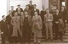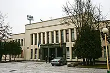 Things started to improve in 1934, when the Physical Culture Palace was opened in Kaunas, featuring a spacious hall with 200 seats and cork floor built for tennis that was suitable for indoor basketball.[8] In 1935, Lithuania decided to promote a World Lithuanian Congress in temporary capital Kaunas, inviting ethnic Lithuanians from many countries to unite the Lithuanian culture. The following year, a delegation of Lithuanian American athletes from Chicago arrived in Kaunas as participants of World Lithuanian Congress. Two of the players, Juozas "Joseph" Zukas and Konstantinas "Konnie" Savickus, stayed to teach basketball secrets to Lithuanians and be a part of the national team.[9] Savickus in particular became a player-coach, and while the national team had just been trounced by inaugural European champions Latvia 123–10, one year later, with Savickus leading the team and exploiting stalling techniques, Lithuania trailed only 14–7 at halftime before losing 31–10.[10]