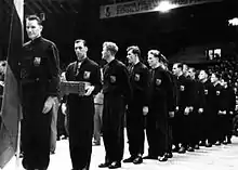 The efforts were successful – the Lithuanians became the champions of Europe for the first time, defeating all their opponents and with Talzūnas being picked as the tournament's most valuable player. Following the final victory over Italy, the famous Lithuanian tenor Kipras Petrauskas even interrupted his performance at the State Theatre to joyfully announce the triumph of the national basketball team. The crowd then rose to their feet and together sang the Lithuanian anthem.[17] The team returned to a warm reception, with thousands gathering at a train station in a way Kriaučiūnas compared to "like we, here in America, greet the president."[18] Basketball regained its ground immediately, and had its popularity rise abruptly, especially among students. Gymnasium teams from almost all counties competed in student games, teams were assembled in firms and basketball courts appeared all around the country. According to future player Stepas Butautas, "In every yard hoops are being made from barrels. Children, teenagers are throwing balls into them, others – even a sock crammed with clouts. Our Veršvai Primary School teacher K. Požemecka built two poles, made hoops from a willow and said: 'We will play basketball'."[19] Future team coach Vladas Garastas added that "as kids we started using a barrel to make a hoop. We didn't have a ball, we stuffed in grass or whatever we could find".[20]