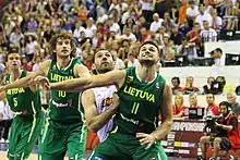 The Lithuania men's national basketball team (Lithuanian: Lietuvos nacionalinė vyrų krepšinio rinktinė) represents Lithuania in international basketball competitions. They are controlled by the Lithuanian Basketball Federation, the governing body for basketball in Lithuania. Despite Lithuania's small size, with a population of less than 3 million, the country's devotion to basketball has made them a traditional force of the sport in Europe.[4]