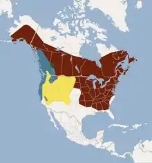 | Distribution of all little brown bat subspecies: M. l. lucifugus (red), M. l. pernox (green), M. l. alascensis (blue), M. l. carissima (yellow), M. l. relictus (gray)[2] | |