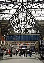 The station was designed by GER engineer Edward Wilson and built by Lucas Brothers; the roof was designed and constructed by the Fairburn Engineering Company.[17] The overall design was approximately Gothic, built using stock bricks and bath stone dressings. The building incorporated booking offices as well as the company offices of the GER, including chairman's, board, committee, secretary and engineers' rooms. The roof was spanned by four wrought iron spans, two central spans of 109 ft (33 m) and outer spans of 46 and 44 ft (14 and 13 m), 730 ft (220 m) in length over the eastern main lines, and 450 ft (140 m) long over the local platforms;[19] the station had 10 platforms, two of which were used for main-line trains and the remainder for suburban trains.[20]