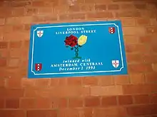 In 1991, an additional entrance was constructed on the east side of Bishopsgate with a subway under the road.[84] The station was "twinned" with Amsterdam Centraal railway station on 2 December 1993, with a plaque marking this close to the entrance to the Underground station.[85]