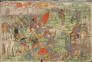 Russian successes followed similar patterns featuring a multitude of small campaigns, with sieges where musketmen played a key role in destroying wooden defences with effective artillery support.[30] The Tsar's forces took important fortresses like Fellin (Viljandi), yet lacked the means to gain the major cities of Riga, Reval (Tallinn), or Pernau (Pärnu).[29] The Livonian knights suffered a disastrous defeat by the Russians at the Battle of Ērģeme in August 1560. Some historians believe the Russian nobility were split over the timing of the invasion of Livonia.[33]