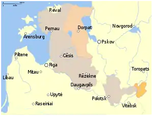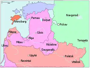 By the mid-16th century, economically prosperous Old Livonia[2] had become a region organised into the decentralised and religiously divided Livonian Confederation.[3] Its territories consisted of the Livonian branch of the Teutonic Order, the prince-bishoprics of Dorpat (Tartu), Ösel–Wiek, as well as Courland, the Archbishopric of Riga and the city of Riga.[2][4] Together with Riga, the cities of Dorpat (Tartu) and Reval (Tallinn), along with the knightly estates, enjoyed privileges enabling them to act almost independently.[4] The only common institutions of the Livonian estates were the regularly held common assemblies known as Landtags.[2] As well as a divided political administration, there were also persistent rivalries between the Archbishop of Riga and the Landmeister of the Order for hegemony.[nb 1][2][4] A schism had existed within the Order since the Reformation had spread to Livonia in the 1520s, although the transformation of the country into a Lutheran region was a gradual process, resisted by part of the Order that to a varying degree remained sympathetic to Roman Catholicism.[5] As war approached, Livonia had a weak administration subject to internal rivalries, lacked any powerful defences or outside support, and was surrounded by monarchies pursuing expansionist policies. Robert I. Frost notes of the volatile region: "Racked with internal bickering and threatened by the political machinations of its neighbours, Livonia was in no state to resist an attack."[6]